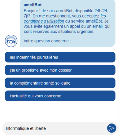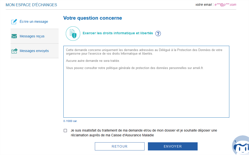 - Utiliser le chatbot (oui on ne peut accéder à l’envoi de message directement… Taper « Informatique et liberté »