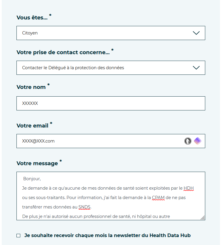 Je demande à ce qu'aucune de mes données de santé soient exploitées par le HDH ou ses sous-traitants. Pour information, j'ai fait la demande à la CPAM de ne pas transférer mes données au SNDS.