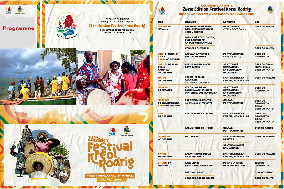 Le commissaire de la Culture, des Arts et des Sports, Varock Ravina, a dévoilé ce lundi 24 novembre le programme officiel des activités de la 26ᵉ édition du Festival Kreol Rodrigues. Placée cette année sous le slogan “Ansanm Nou Kiltir Kréol Al Pli Lwin”, cette édition, véritable événement phare du calendrier culturel local, fera vibrer l’île pendant une semaine en mettant en lumière le talent des artisans et l’importance de leur contribution à la vie culturelle et économique de cette destination touristique située au cœur de l’océan Indien.