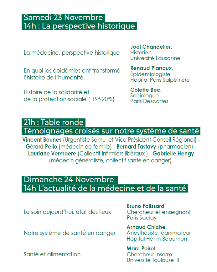 La table ronde du samedi soir réunira cette année des acteurs de différents horizons mais tous plongés au cœur de notre système de santé : Vincent BOUNES, urgentiste et vice-président de la région Occitanie en charge de la santé ; Gérard PELLO, médecin à Beaumont-de-Lomagne ; Bernard TASTAVY, pharmacien à Mas-Grenier ; Lauriane VERMOERE, coordinatrice du collectif "Infirmiers libéraux en colère" en Occitanie ; et Gabrielle HENGY, médecin à Limogne-en-Quercy et membre du Collectif Santé en Danger.