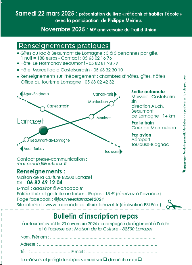 Ce sera la fonction de l’édition 2024 des Journées de Larrazet de comprendre ce qui se joue, de partager les savoirs, les regards, les questionnements et aider ainsi à esquisser les bonnes réponses pour le bien (ou le mieux) être de chacun et de tous.