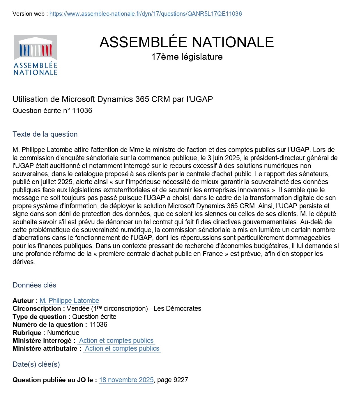 Le député Philippe Latombe communique - Utilisation de Microsoft Dynamics 365 CRM par l'UGAP